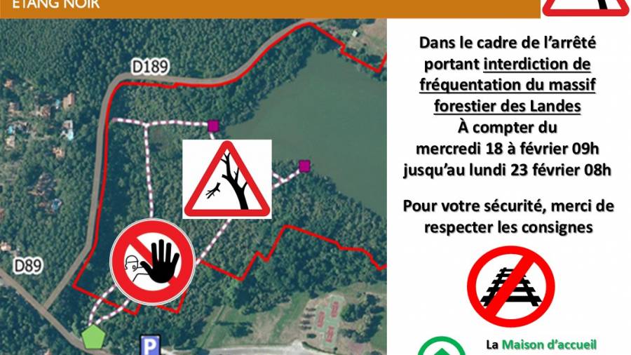 Dans le cadre de l'arrêté préfectoral portant interdiction de fréquentation du massif forestier du département des Landes à compter du mercredi 18 février à 09h jusqu'à lundi 23 février 08h